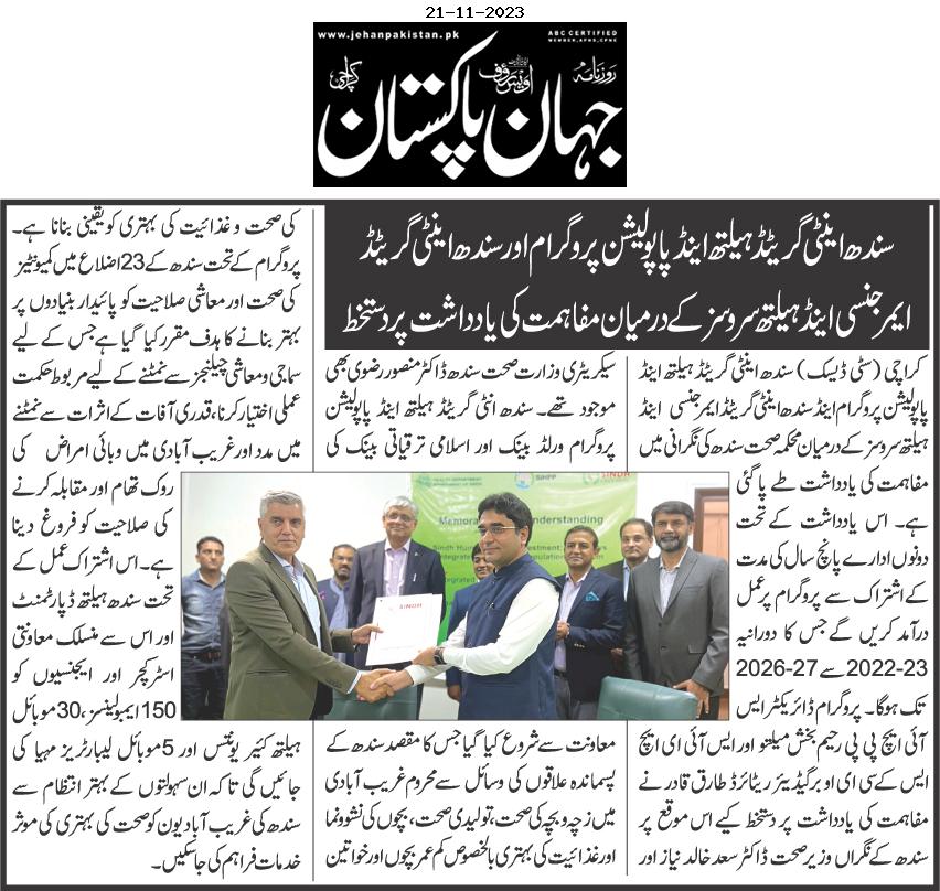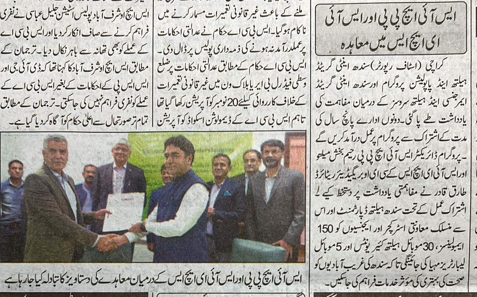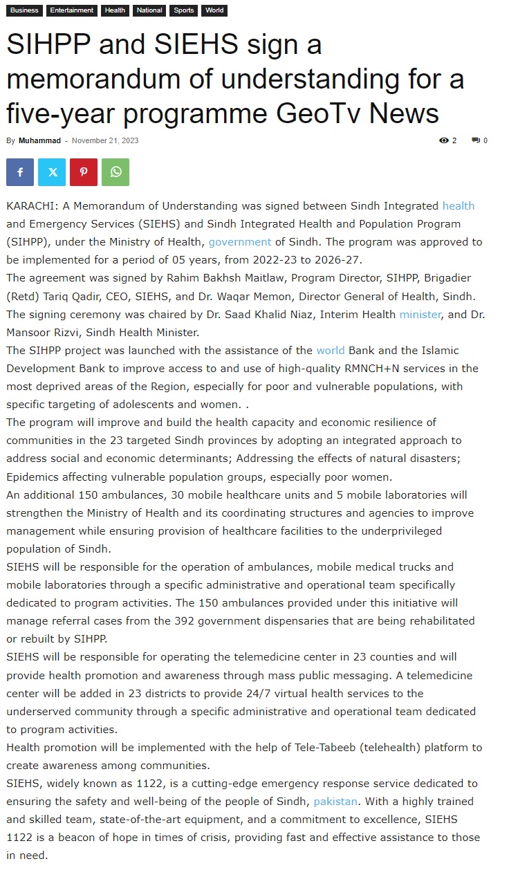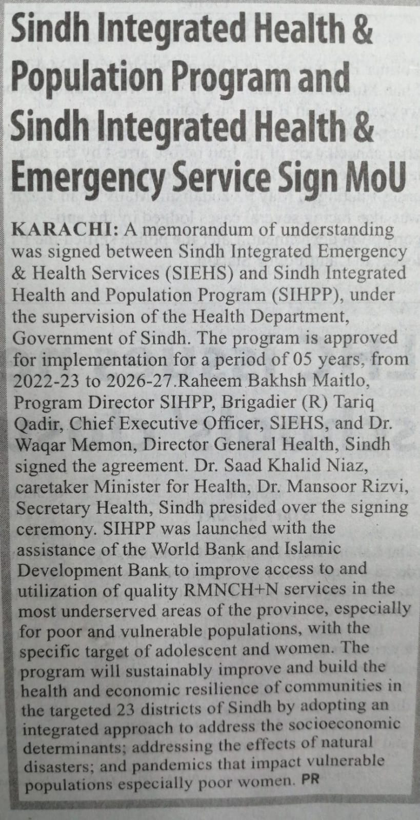 Karachi, November 20, 2023Sindh Integrated Health and Population Program (SIHPP) signed a Memorandum of Understanding with Sindh Integrated Emergency & Health Services (SIEHS) under the supervision of the Health Department, Government of Sindh. Under this initiative, SIHPP is providing 60 ambulances, 30 mobile medical vans, and 5 mobile laboratories to SIEHS in the first phase. The program is approved for implementation for a period of 05 years, from 2022-23 to 2026-27.